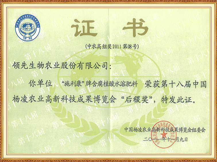 施利康牌含腐植酸水溶肥料—第十八届中国杨凌农博会“后稷奖”