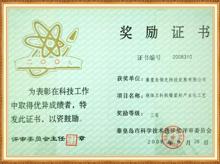 液体豆科根瘤菌剂产业化工艺—秦皇岛市科学技术进步三等奖